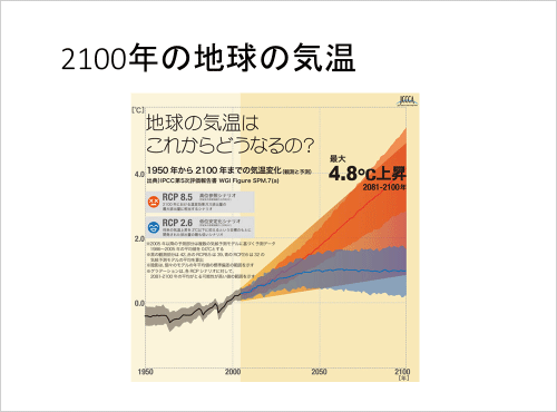 これは環境省が国連のIPCCと呼ばれる機関のデータを基に作ったグラフですが、2100年に最大4.8度上がると予想されています。温度上昇の予想の幅は非常に大きく、あまり上がらないケースだと、逆に下がるかもしれないという研究結果もあるほどです。2100年になると、ひょっとすると地球の気温が下がるかもしれない。なぜこういうことがわからないかというと、地球のことなので実験できないからです。温室効果ガスといわれる二酸化炭素や雲もそうですが、こういうものは太陽の光を通しますが、地球の表面で反射された熱赤外線は通さない性質があります。